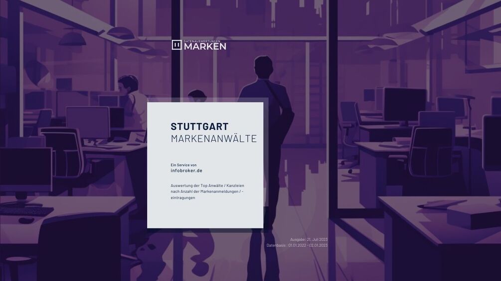 Unsere Auswertung zu Markenanwälten für Stuttgart hat die Markenanmeldungen zu Anwälten mit der Adressangabe Stuttgart in einem Ranking nach Anzahl der Marken zusammengefasst.